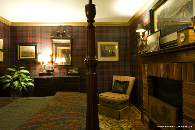 Tartan saturation! The walls and window treaments, all in the same Tartan pattern, provide a cozy backgraound for all the lovely collectibles.