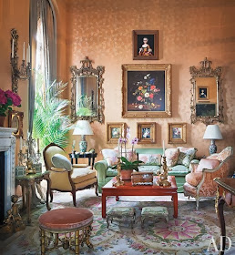 Designer Henri Samuel creates a feast for the eyes in this wonderful room. Layering patterns can be challenging, but when done right, the payoff is well worth the effort. If this is too much for you practice on it by taking away elements and deciding on at least 2 other patterns you would like to continue to use against the green marbled effect background. Maybe just the rug, the red tufted ottoman and the leafy patterned chairs.