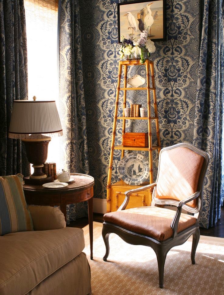 Faux bamboo etageres are very popular. Here a white one blends beautifully into the walls of this pretty sitting area.