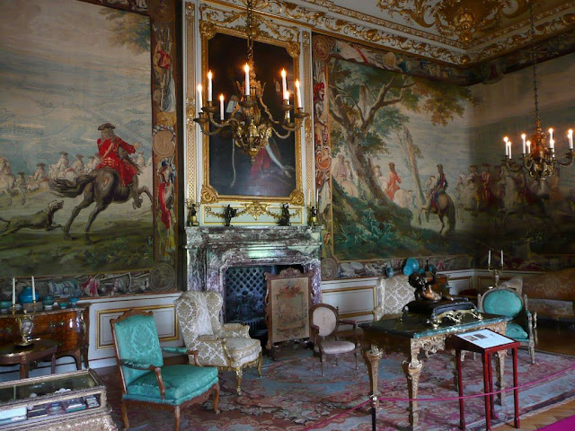 A beautiful antique needlepoint firescreen adorns the fireplace and compliments the stunning tapestries of the 2nd State Room of Blenheim Palace.