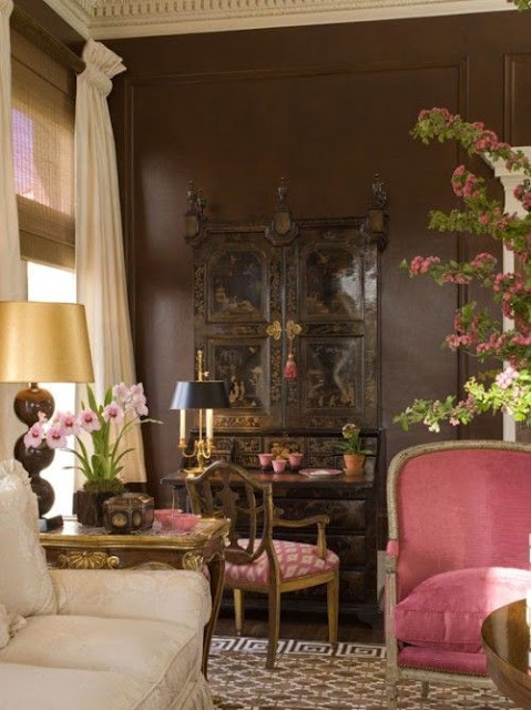 Victorians loved dark rich colors and today brown paint is being used by all the best decorators. You will see more pink and brown interiors later on in the post.
