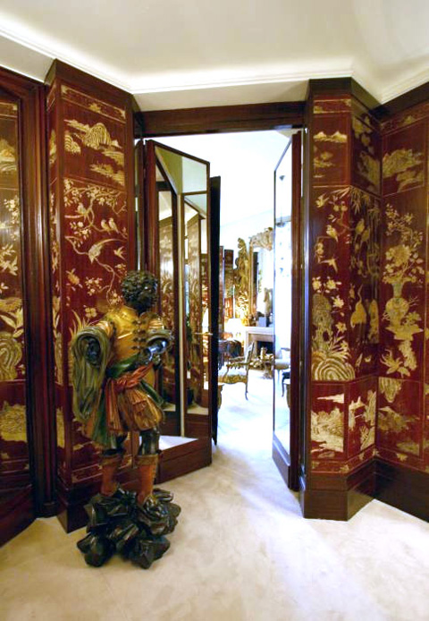 She is said to have hated doors and obscured  them with Chinese screens. Coco Chanel was famous for owning over 32 Coromandel screens that decorated her 31 rue Cambon apartment in Paris. In some areas she applied them to the walls like wallpaper. "I've loved Chinese screens since I was eighteen years old..... I nearly fainted with joy when, entering a Chinese shop I saw a Coromandel for the first time. Screens were the first thing I bought," she said.