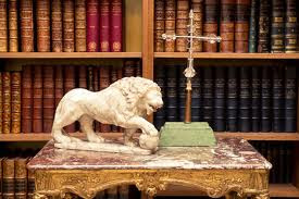 The dining room. On the table are some of the many lions that are scattered around the apartment.
