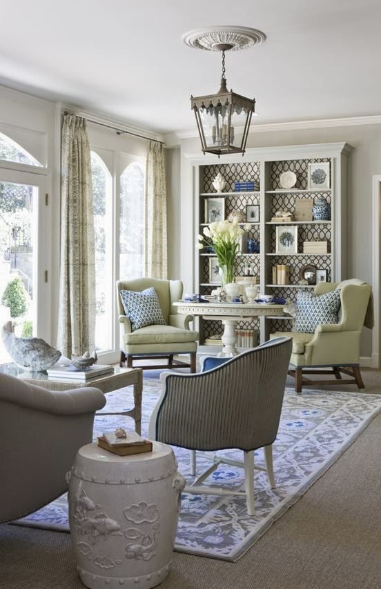 I love these beautiful white Chinese garden seats. Here they are perfect as tables in front of the sofa.