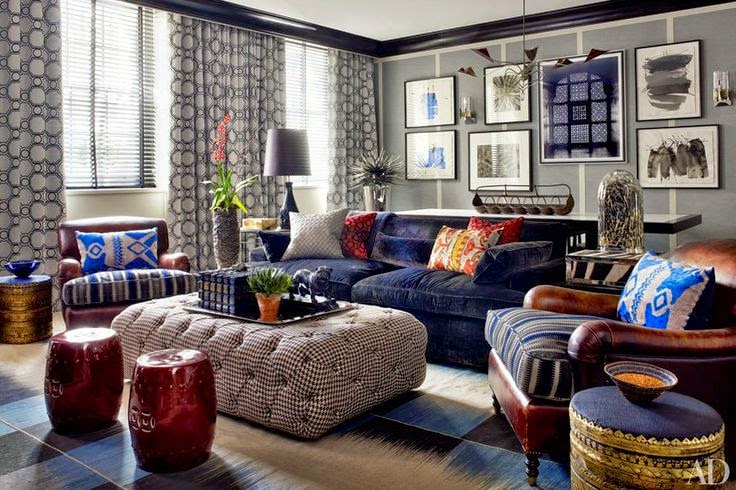 Traditional blue and white garden seats used as end tables in this Tory Burch designed room.