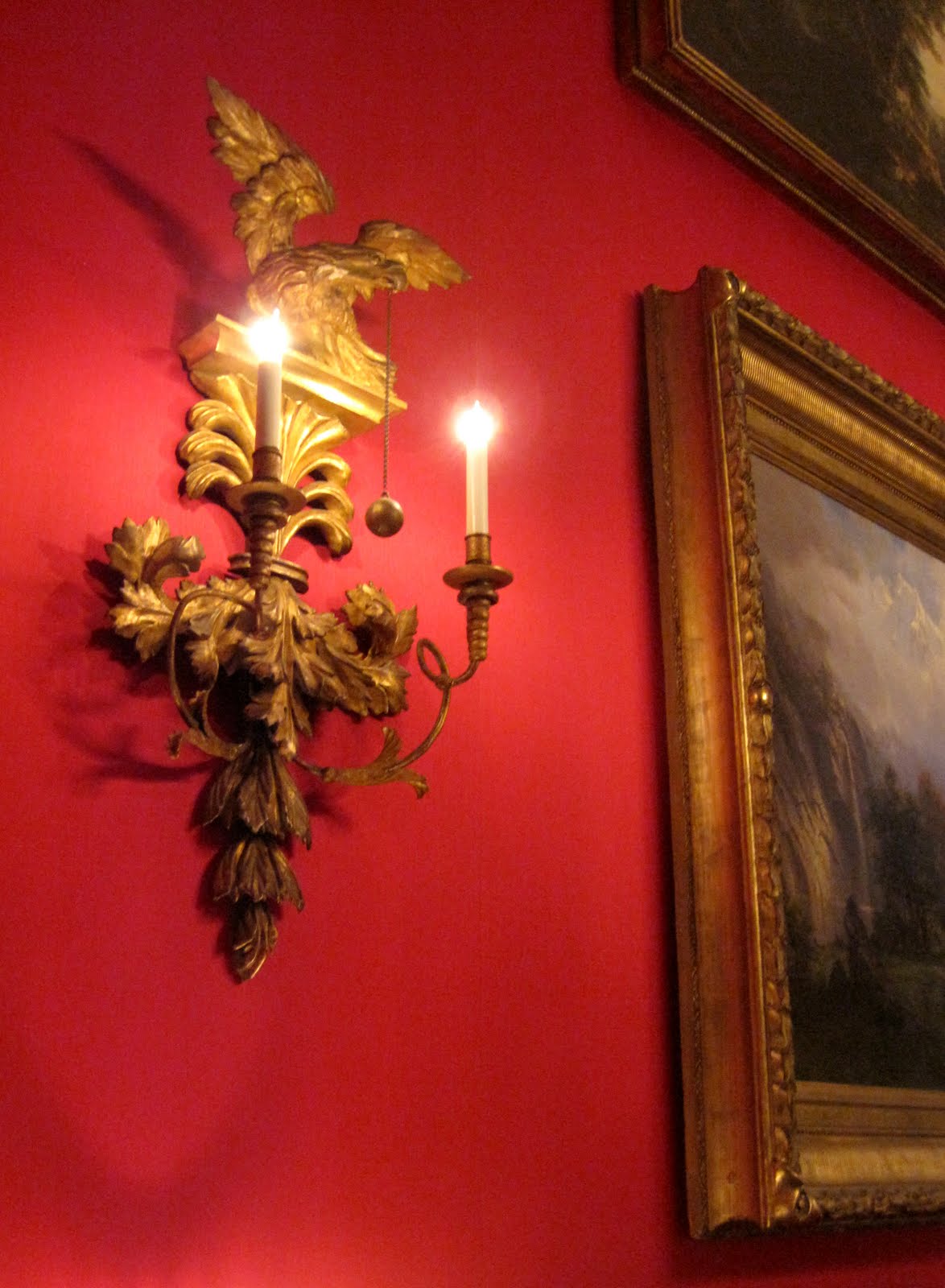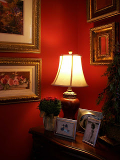 This wall has been decorated using a stencil and gold metallic paint. Stenciling is fun and there are so many pretty patterns now to choose from. I like the gold leafed woodwork also.