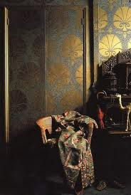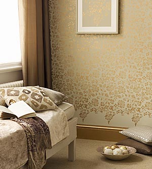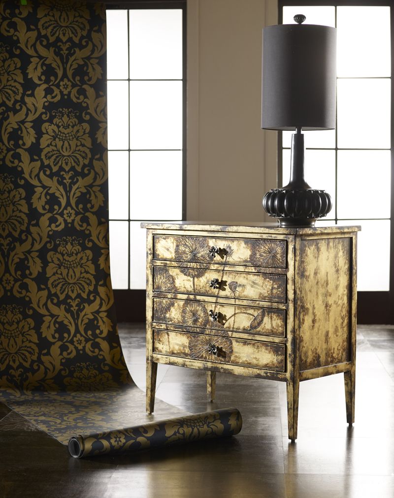 Example of the many fabulous metallic wallpapers available today. Be creative. Find an old piece of furniture at a yard sale or flea market and use metallic paint to give it a fresh look. There are many stencil designs you can use or it you are artistic, create your own designs.
