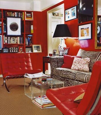 These bold Barcelona Chairs look wonderful in this red lacquered retro style room. The chairs and the animal print are two classics that work well together.