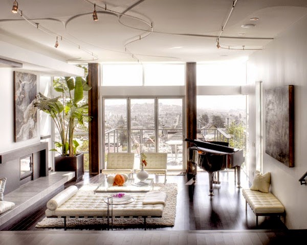 This lovely room features classic architecture mixed with Mid-Century Modern iconic elements such as the white leather Barcelona Chairs and ottomans, the Arco floor lamp, and the Cherner wooden chairs.