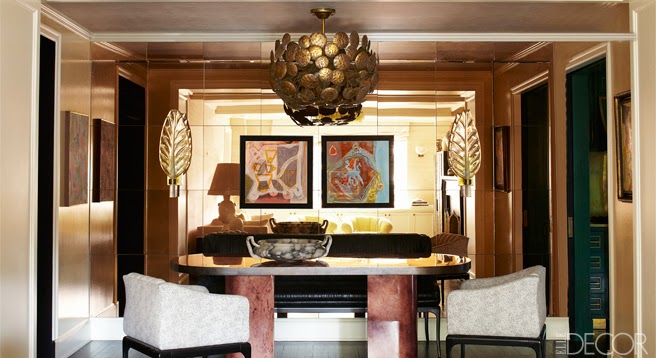 Diaz's dining room in hues of burnished metals and lustrous minerals: malachite, onyx, rose gold, silver, and copper. Designers continue to encourage mixing metals for a layered look.