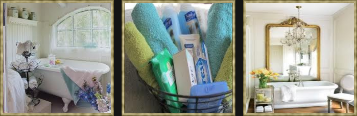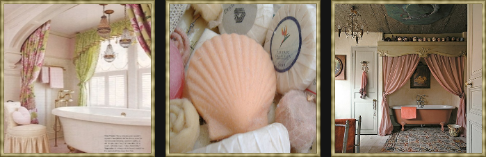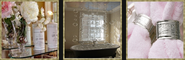 Pink bathrooms are so feminine and pretty. Hang lots of mini chandeliers over the claw foot tub for a lighting statement. Don't forget the bath soaps!! Incorporating architectural elements in you bathroom design is a great idea. Remember you can always paint your claw foot a pretty color. Make your bath a romantic refuge with lots of pretty accessories. Love the bubbles! So whimsical! Napkin rings for your washcloths is an elegant clever idea.