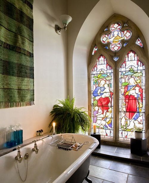 This fabulous bath features a roll top claw foot, slate floor, and a stained glass window to die for!