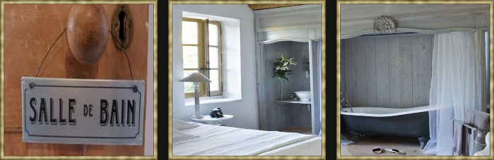 Grey blue painted claw foot and architectural elements make this a very pretty French Country bathroom.