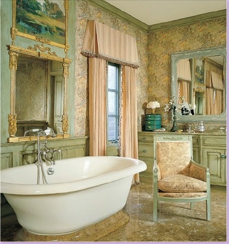 So many beautiful elements in this bathe. Of course the silvered claw foot is center stage but the Venetian mirror, antique sconces, marble backsplash and crystal chandelier are lovely ladies in waiting.