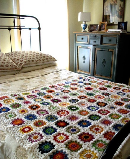 Since the Fall season is upon us with its cool evenings, I thought it the perfect time to pay homage to the afghan. The Granny Square Afghan in particular. I can remember my mother crocheting one in bright colors on a dark green background. I thought it was so ugly......my how I wish I had it today, what a treasure it would be.