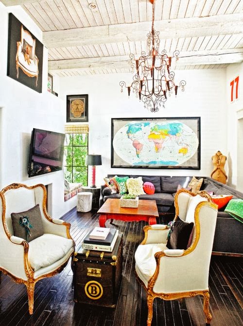 If there are no exposed beams or rafters, install decorative ones. Flooring choices are Wide-plank floors , stone or brick, or even harlequin like this.