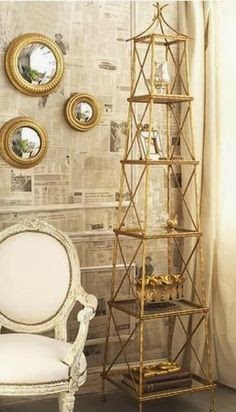 This decorative piece has evolved into the stylistic elegance and simplicity of the brass étagère and has certainly gained iconic appeal today. I have gathered some pictures of beautiful french antique etageres as well as modern versions so you can be inspired to incorporate one into your interiors.
