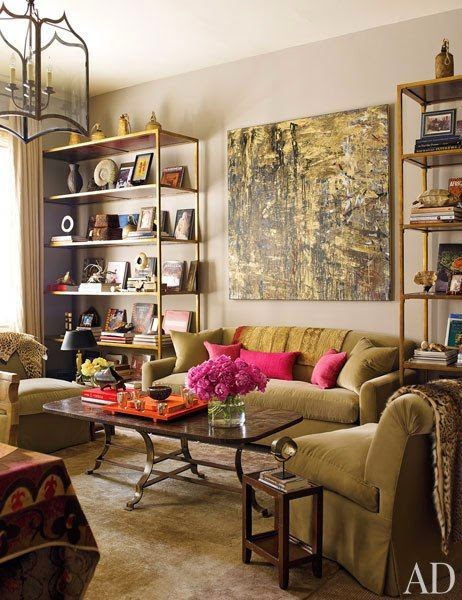 What a fun and eclectic space made all the better with the addition of brass etageres.