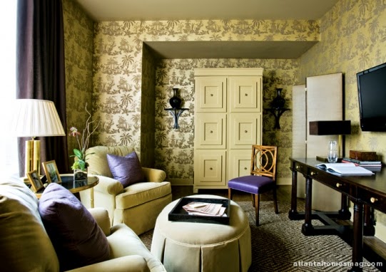 This stylish home office features a Cynthia Rowley desk, great greek key patterned chair, orange Ikat pillow and a trendy brass etagere.