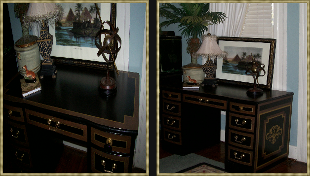 Here is an old desk I recently painted black, added a burled wood paint technique, gilt striping and stenciled motif. A bed would be lovely painted like this and hung with Empire style bed curtains. Make an inexpensive bed look like a million dollars and give it a special place in your French Empire bedroom.